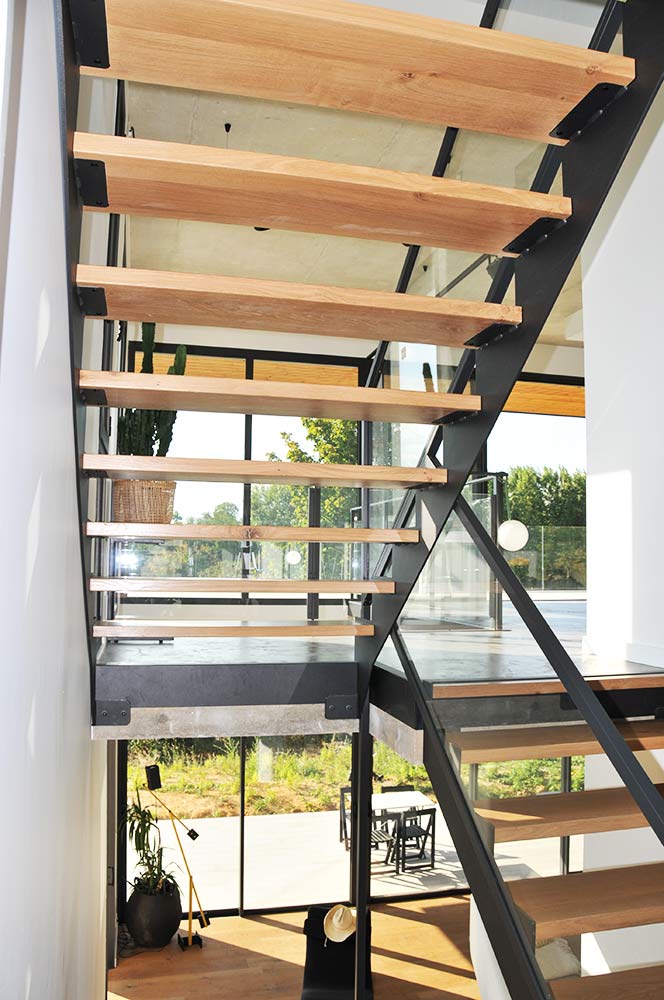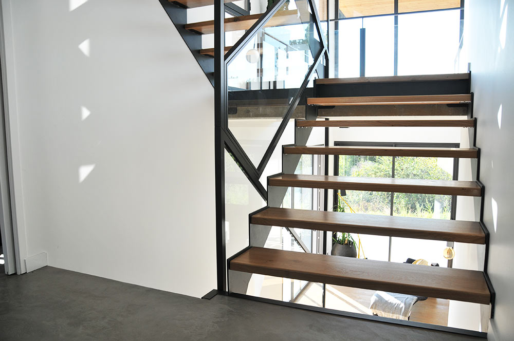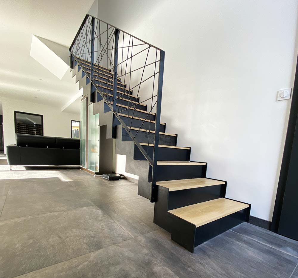 Marches en tôle lisse formant caisson creux pour recevoir un plateau bois.